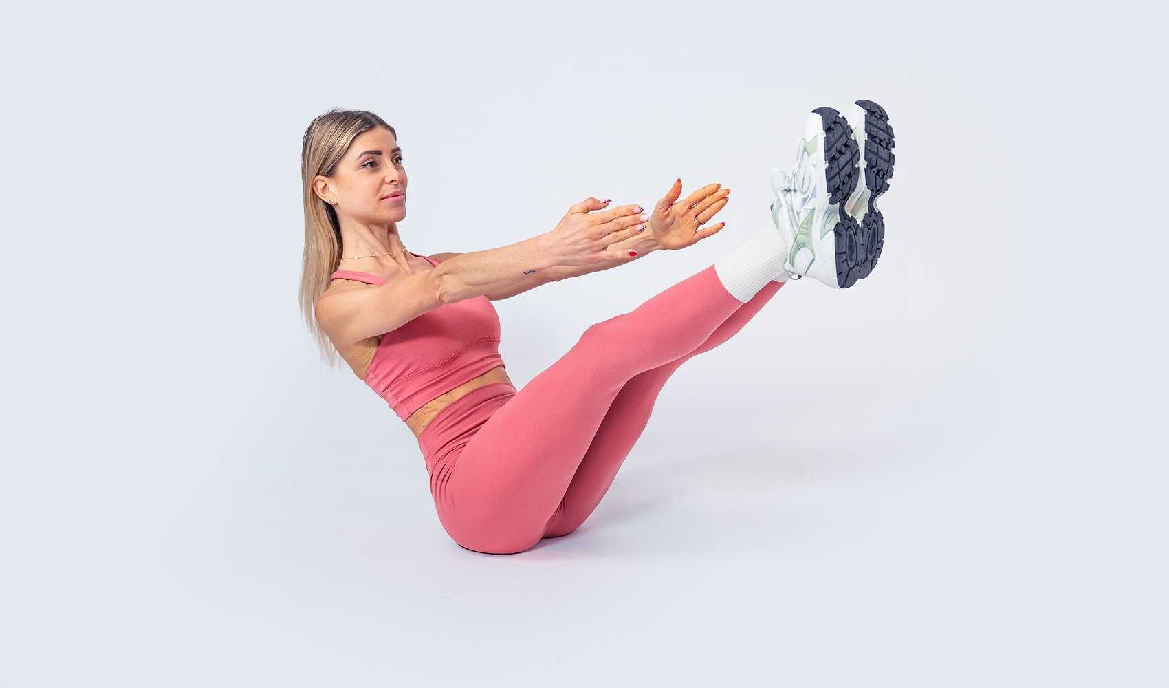 Siéntate con las piernas extendidas, levántalas manteniendo el equilibrio sobre los isquiones, y estira los brazos hacia delante.