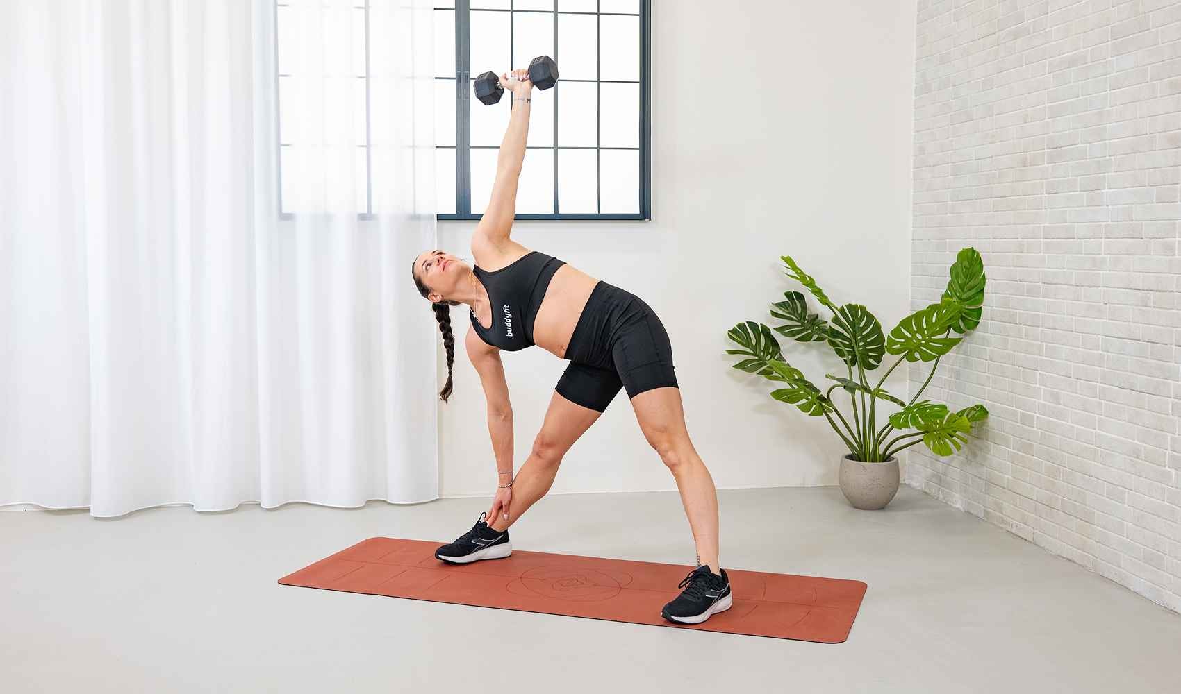 Desde la posición de pie, abre las piernas, gira un pie hacia fuera y extiende el brazo contrario hacia el suelo, el otro hacia el techo.