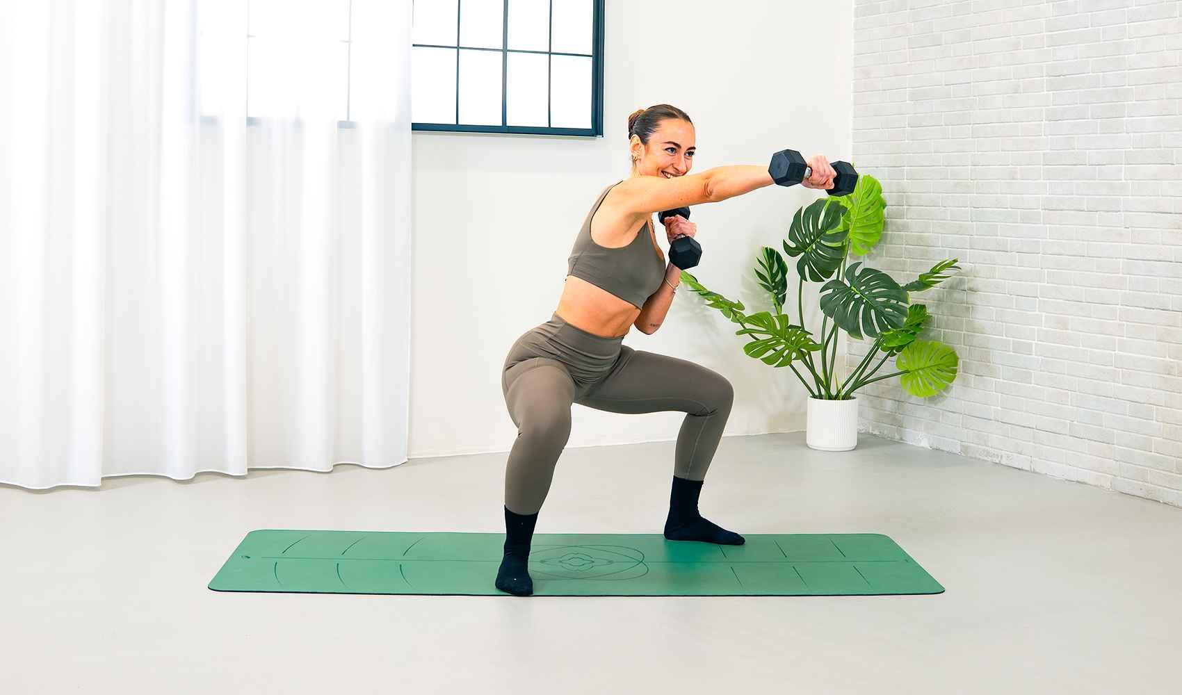 Piega le ginocchia e porta il bacino indietro come se dovessi sederti, mantenendo il petto aperto e la schiena neutra. Poi torna lentamente in posizione iniziale.